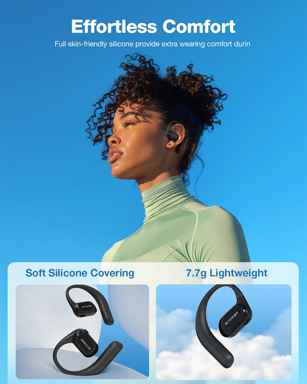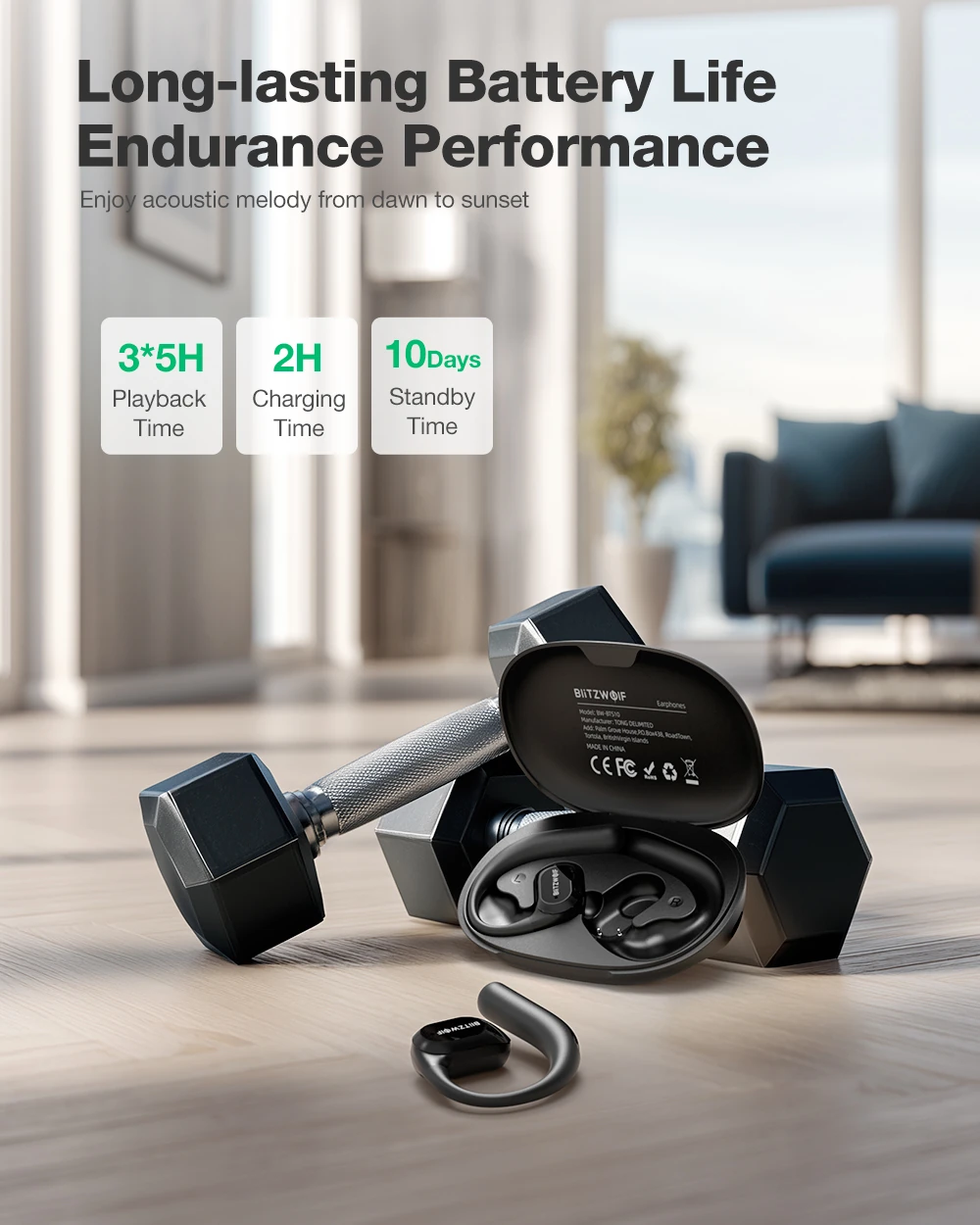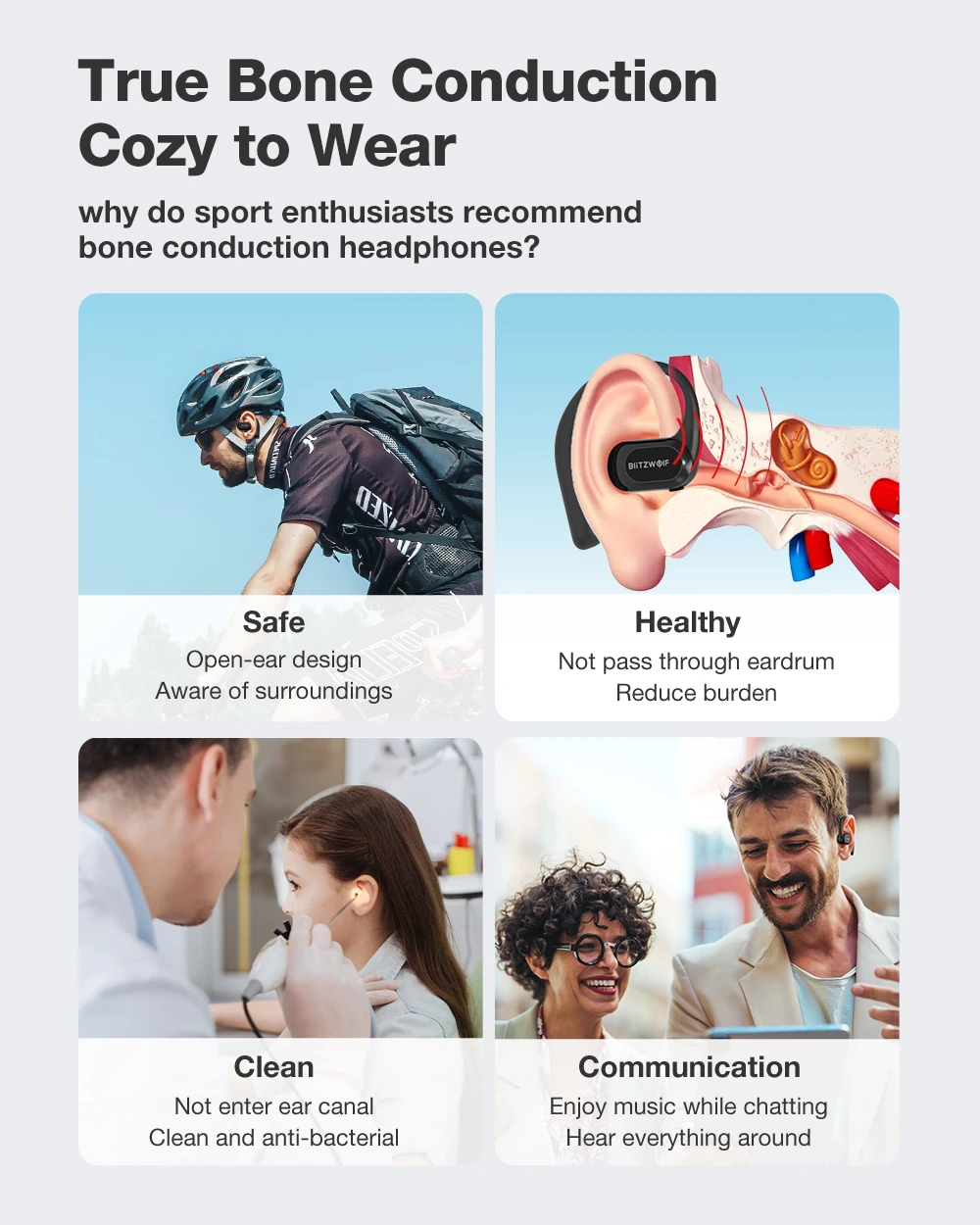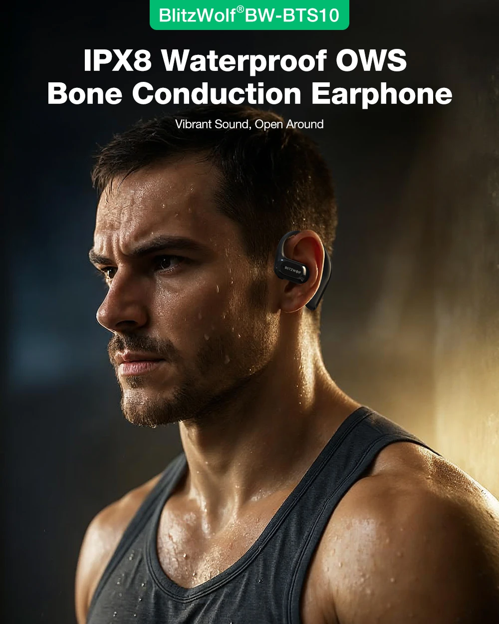 A BlitzWolf® BW-BTS10 fülhallgató nem a hallójáratba illeszkedik, mint a hagyományos fülhallgatók. Helyette a fül elé kell helyezni, ahol a hangszórók rezgése a csontokon keresztül juttatja el a hangot a belső fülbe, így halljuk a zenét. Ennek köszönhetően kényelmes viselet, és nem zárja el teljesen a külvilág hangjait, így biztonságosabb a használata, például sportolás közben.