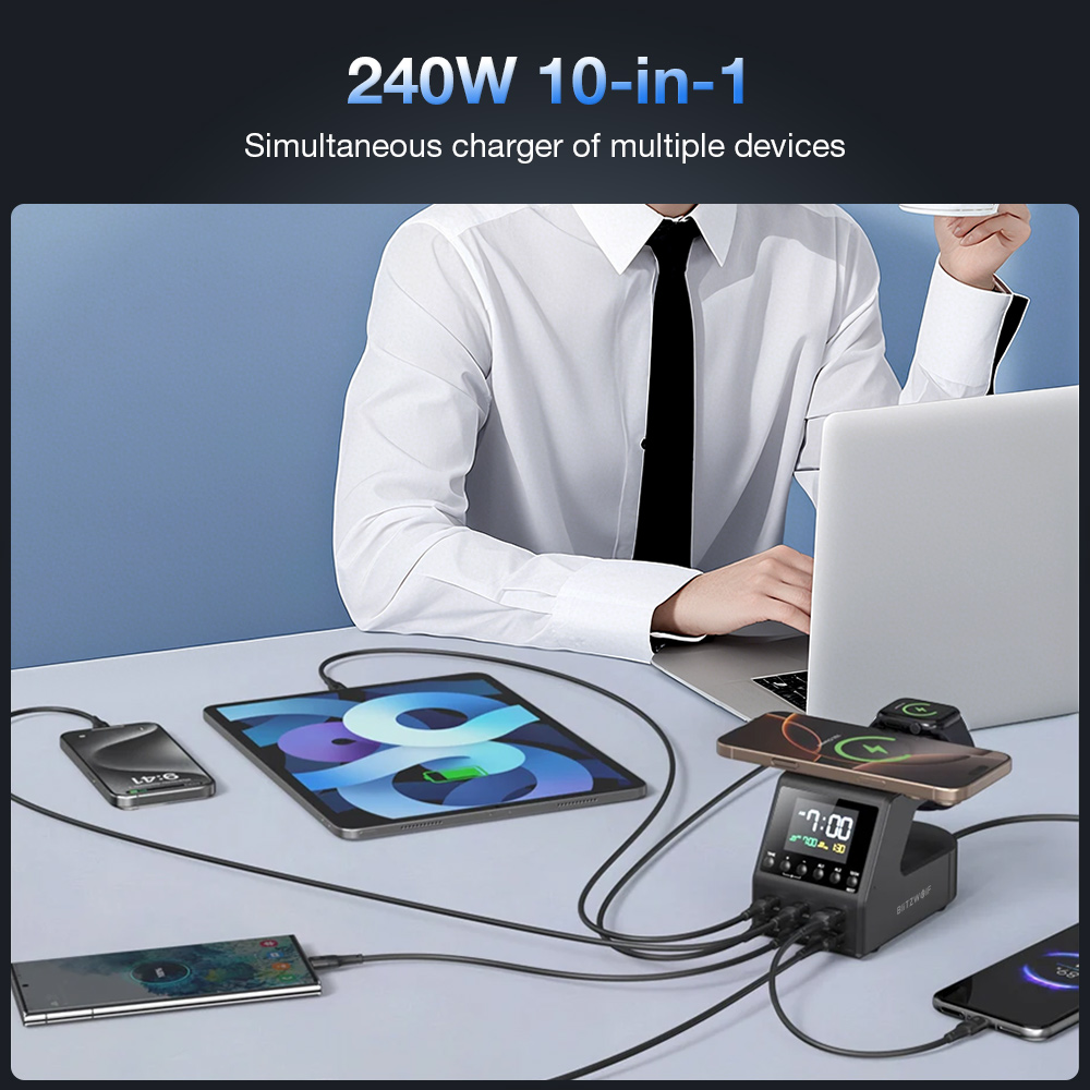 10 az 1-ben asztali töltő: Tölts egyszerre 10 eszközt, 240W összteljesítménnyel.