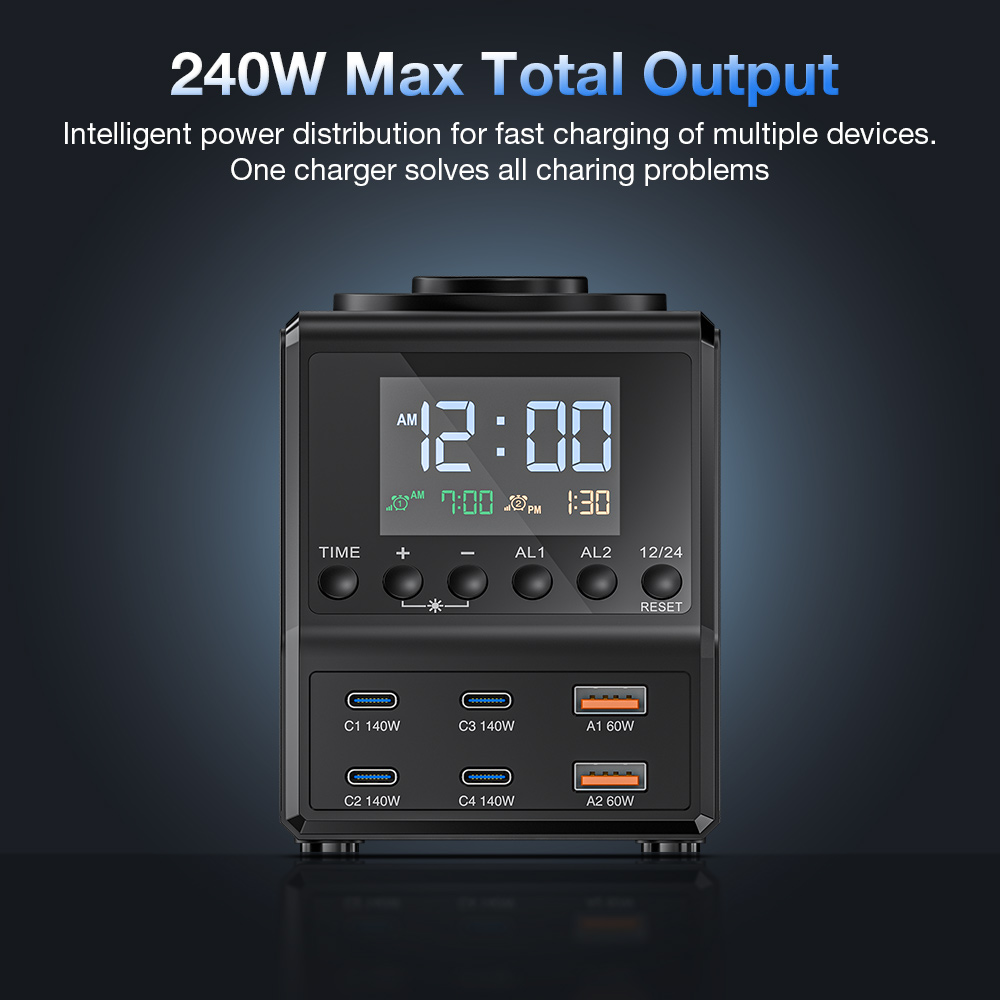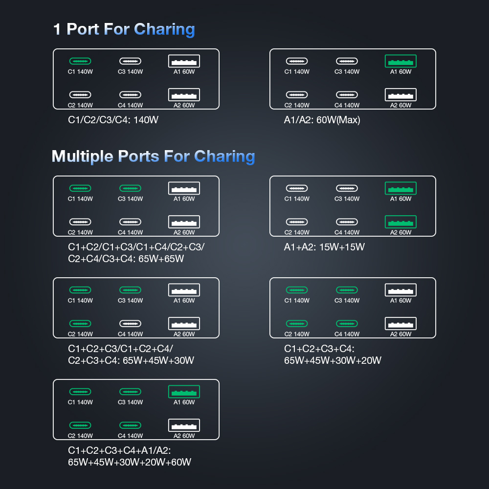 USB-C1/C2/C3/C4: PD3.1 5V/3A 9V/3A 12V/3A 15V/3A 20V/5A 28V/5A PPS: 3.3-21V/5A 140W(Max) USB-C1+C2/C1+C3/C1+C4/C2+C3/C2+C4/C3+C4: 65W+65W USB-C1+C2+C3/C1+C2+C4/C2+C3+C4: 65W+45W+30W USB-C1+C2+C3+C4: 65W+45W+30W+20W USB-A1/A2: QC3.0 5V/3A 9V/3A 12V/3A 20V/3A 60W(Max) USB-A1+A2: 15W+15W USB-C1+C2+C3+C4+A1/A2: 65W+45W+30W+20W+60W 220W(Max) Phone Wireless Charging: 15W/10W/7.5W/5W Watch Wireless Charging: 5W