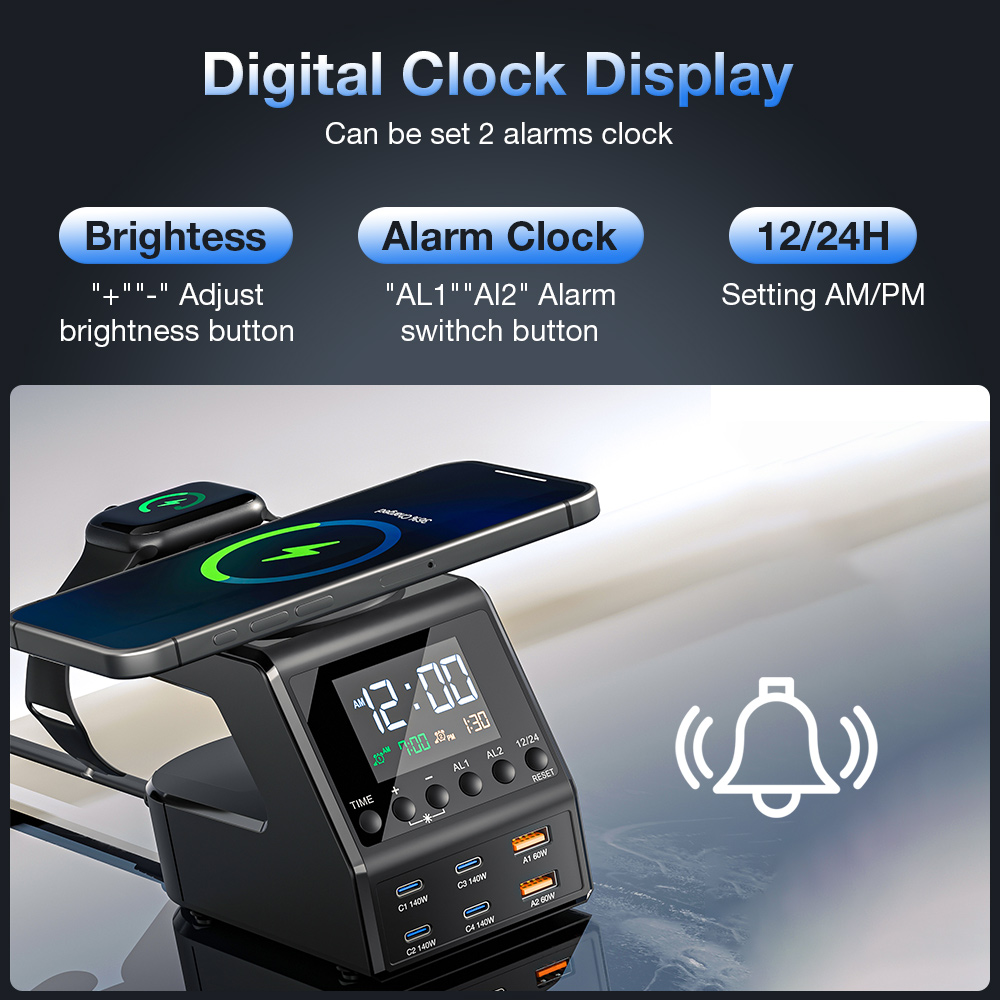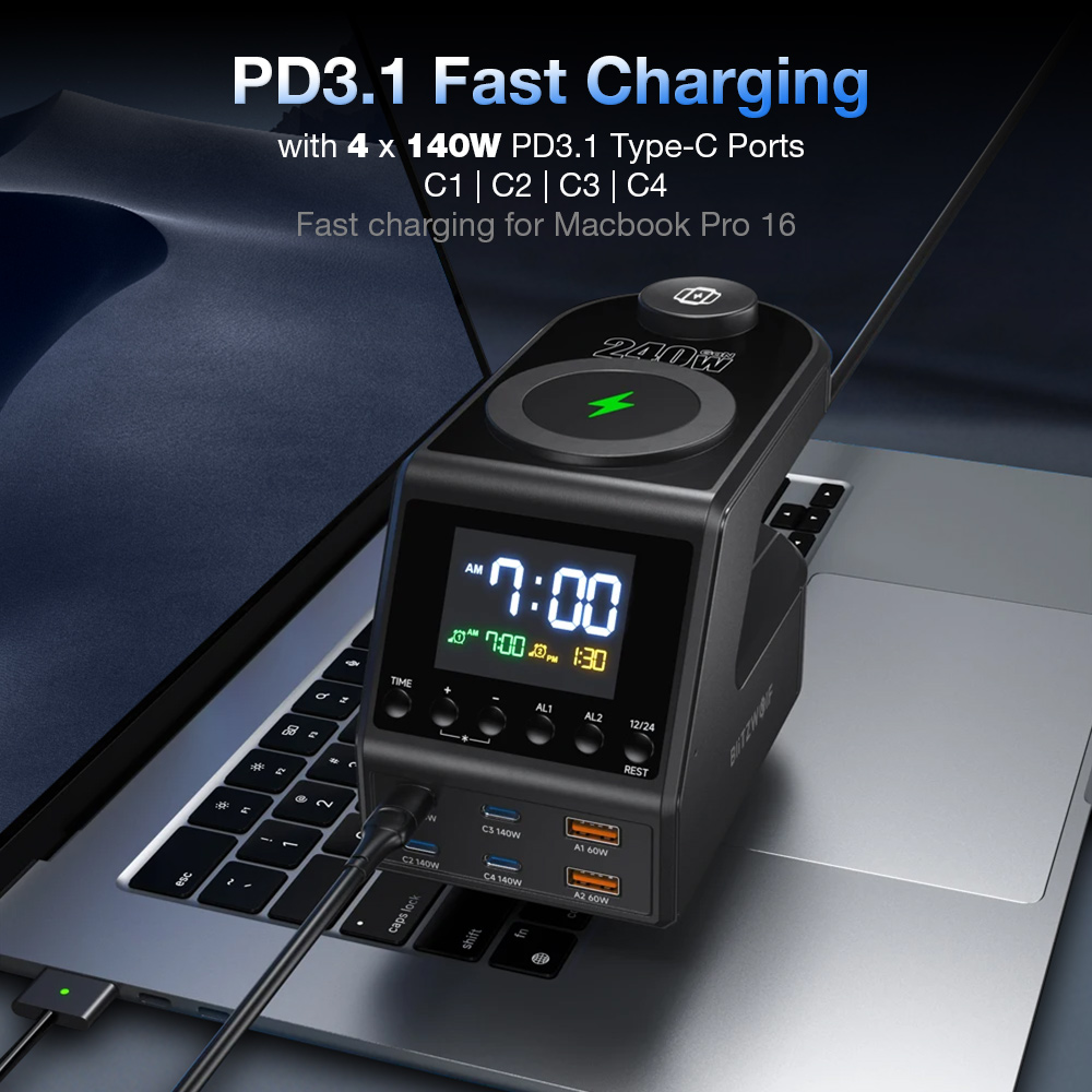 BlitzWolf® BW-FWC10: 240W-os asztali gyorstöltő és ébresztőóra |