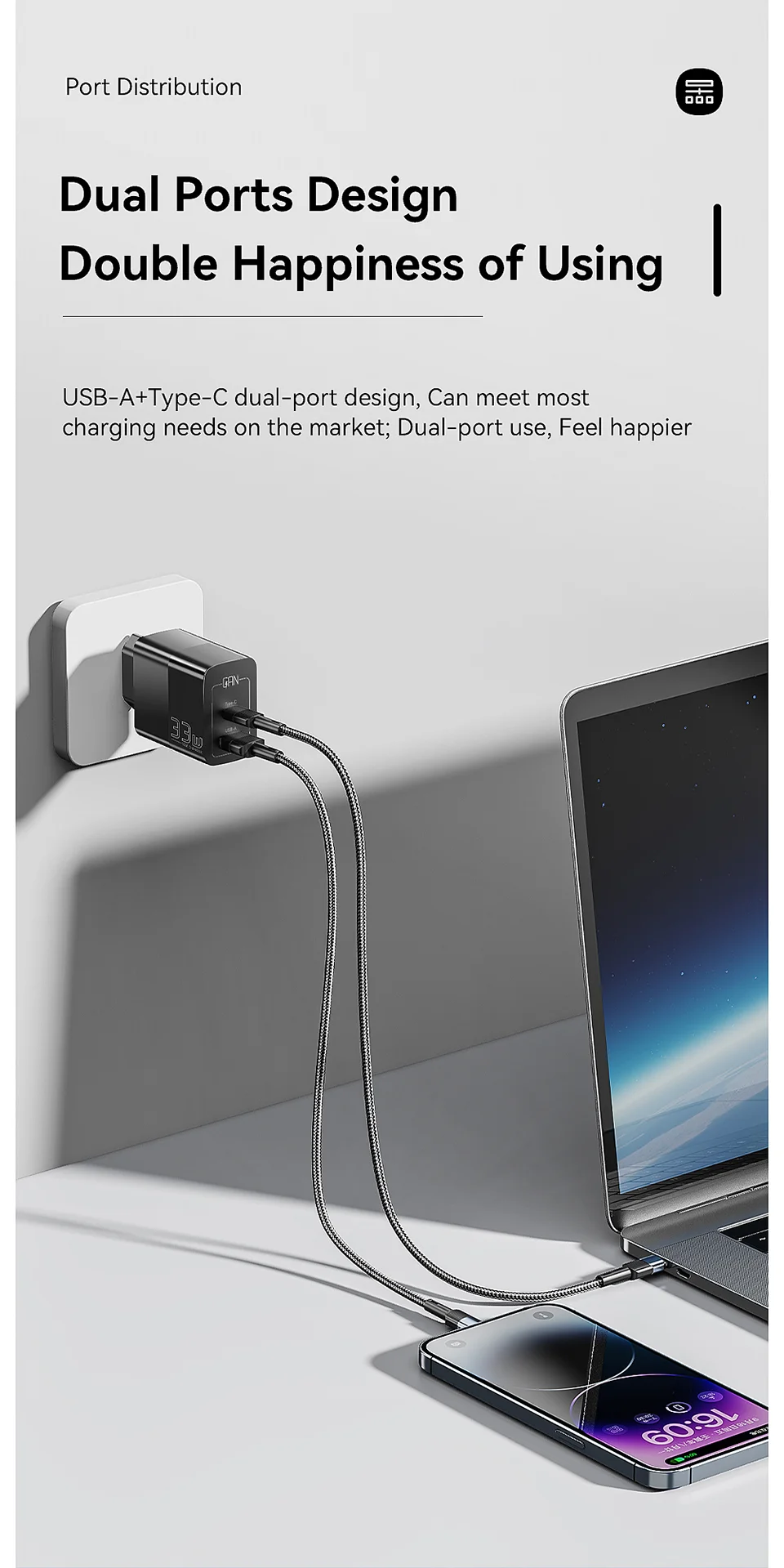 Vége a dilemmának, hogy a telefonodat vagy a tabletedet töltsd-e előbb. Az USB-C és USB-A portok kettőse lehetővé teszi, hogy egyszerre két eszközt is elláss energiával.