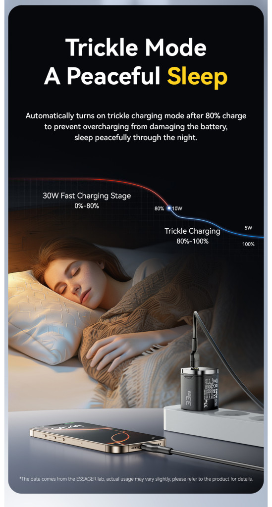 Akkumulátorkímélő üzemmód: A "Trickle Charging" (csepptöltés) funkció megvédi az eszközeid akkumulátorát a túltöltéstől. Amikor a készüléked eléri a 80%-os töltöttséget, az ESSAGER intelligensen visszavesz a tempóból, hogy meghosszabbítsa az akku élettartamát.